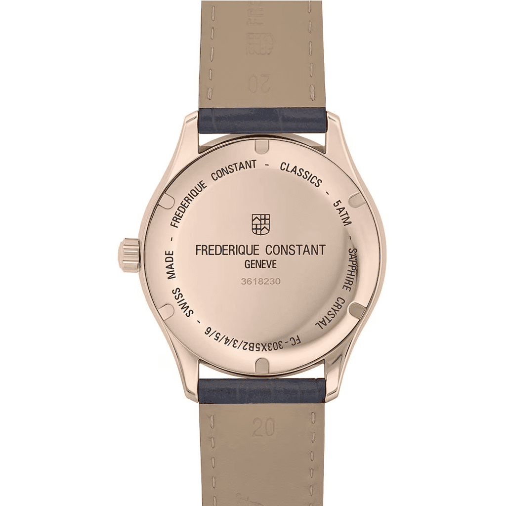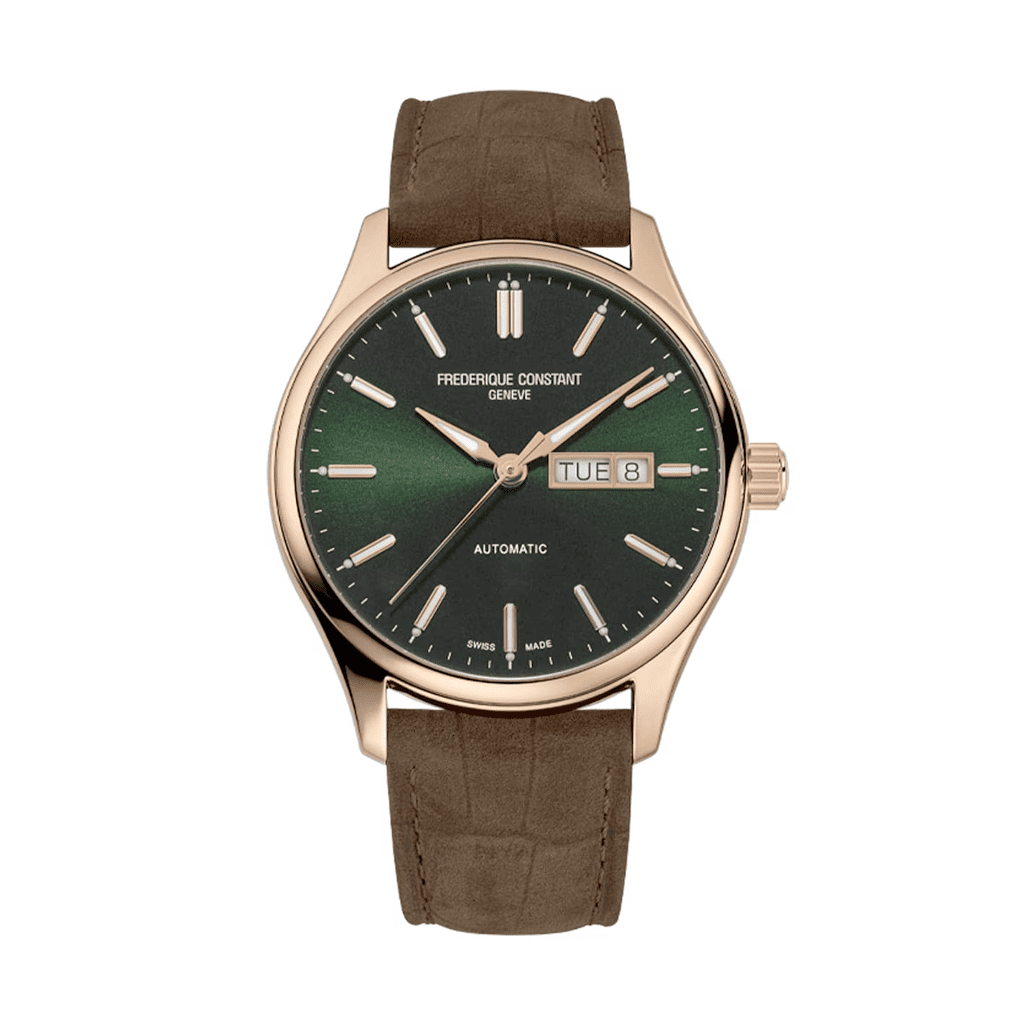 Elegante y refinado, este reloj automático clásico combina una caja de acero con recubrimiento en tono oro rosa y una esfera verde profunda, creando un diseño sobrio pero distintivo. Cuenta con un movimiento mecánico automático (calibre FC-304) que también ofrece día de la semana y fecha. El cristal de zafiro protege la carátula, mientras que la correa de piel marrón le da un aire atemporal. Resistente al agua hasta 50 m (5 ATM), es una pieza versátil y sofisticada, ideal para quienes buscan una combinación de estilo tradicional y funcionamiento confiable.